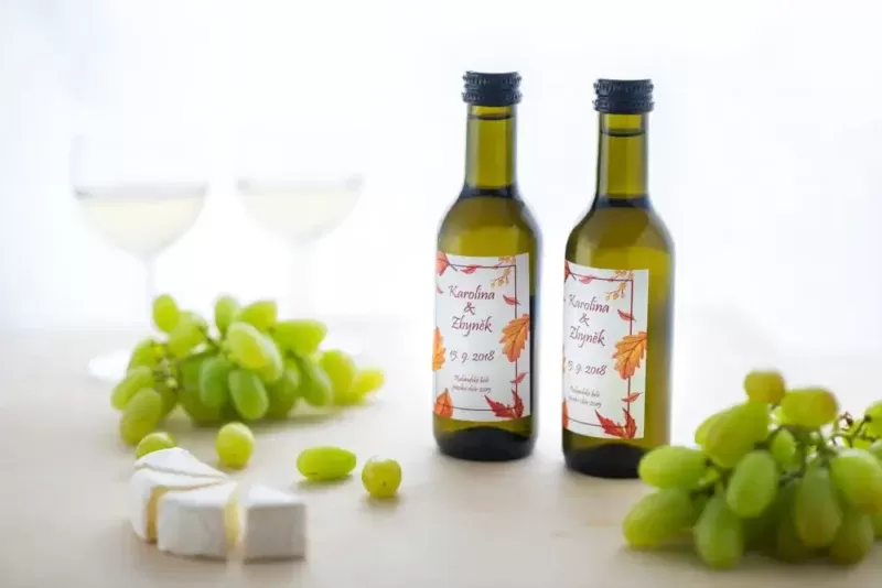 Zajistíme originální dárek pro vaše hosty –  svatební víno – 0,187 l nebo 0,75 l. Pomůžeme vám zvolit svatební etiketu s vašimi jmény a datem svatby. Nabízíme také několik variant designu etikety nebo potisku na láhev. Dodáme vám také vína bez etiket, které si můžete navrhnout a vyrobit sami.
