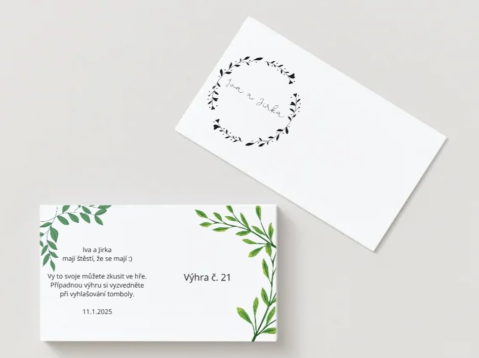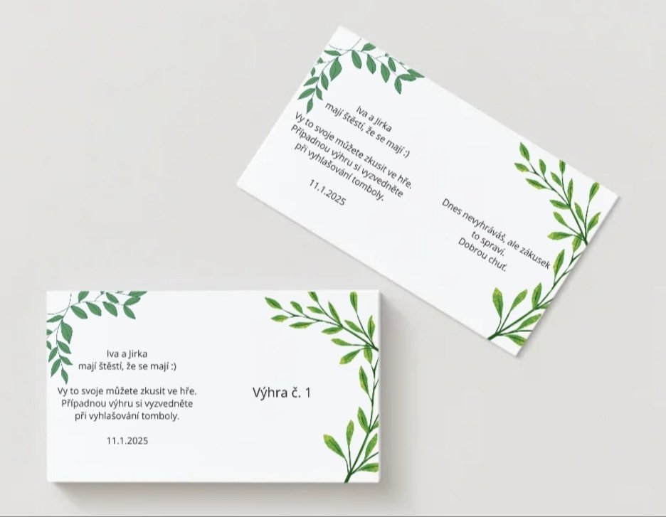 V neposlední řadě bývá na svatbě velmi často tombola a s ní jsou spojené losy. Stírací losy nebo klasické lístečky s čísly, zná nejspíš každý. Já Vám nabízím trochu jinou formu losů, která se dá využít nejen k výhrám, ale také na pobavení i k seznámení hostů formou různých různé úkolů, variant je spousta a je jen na Vás jak je budete chtít využít.