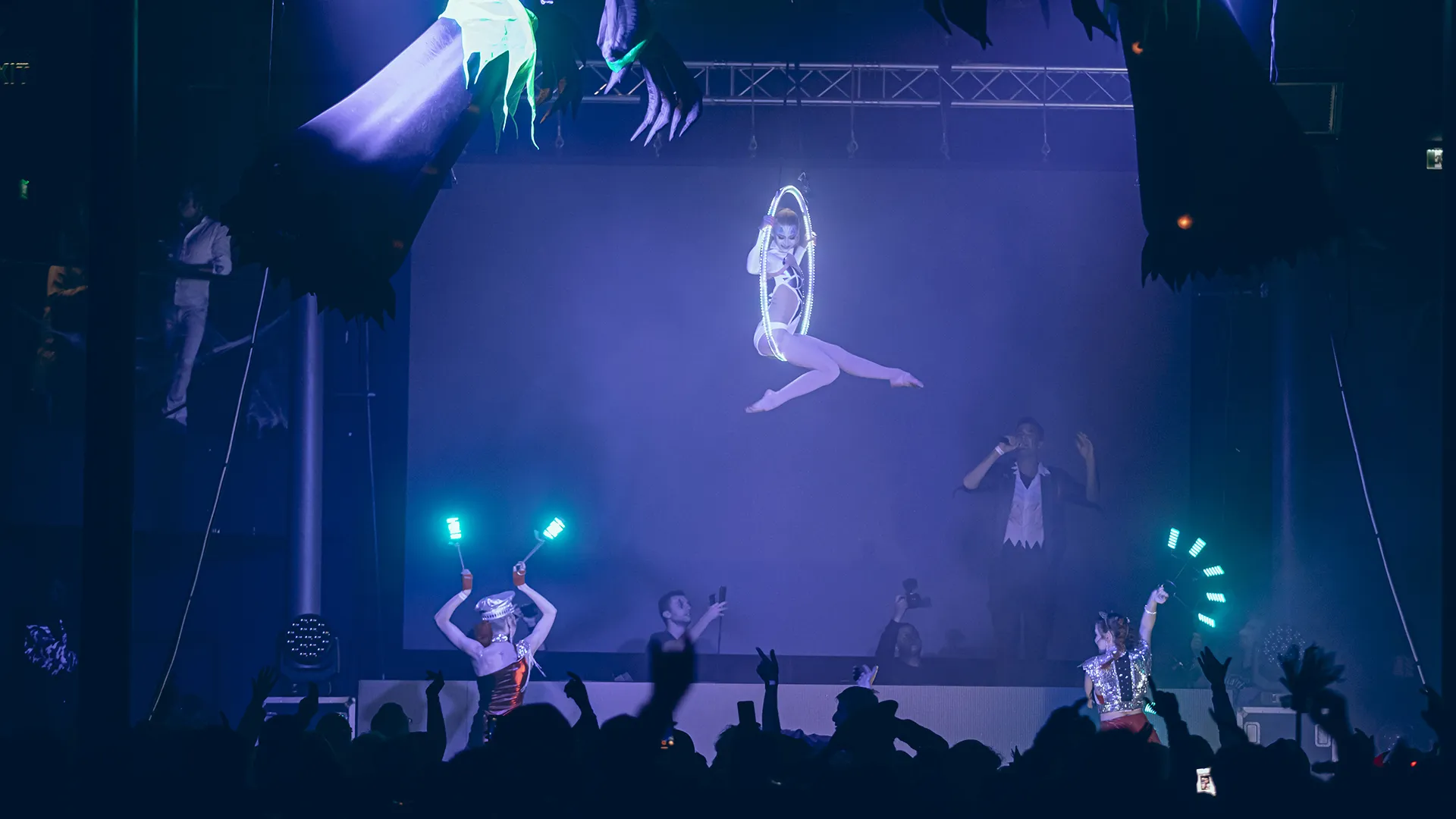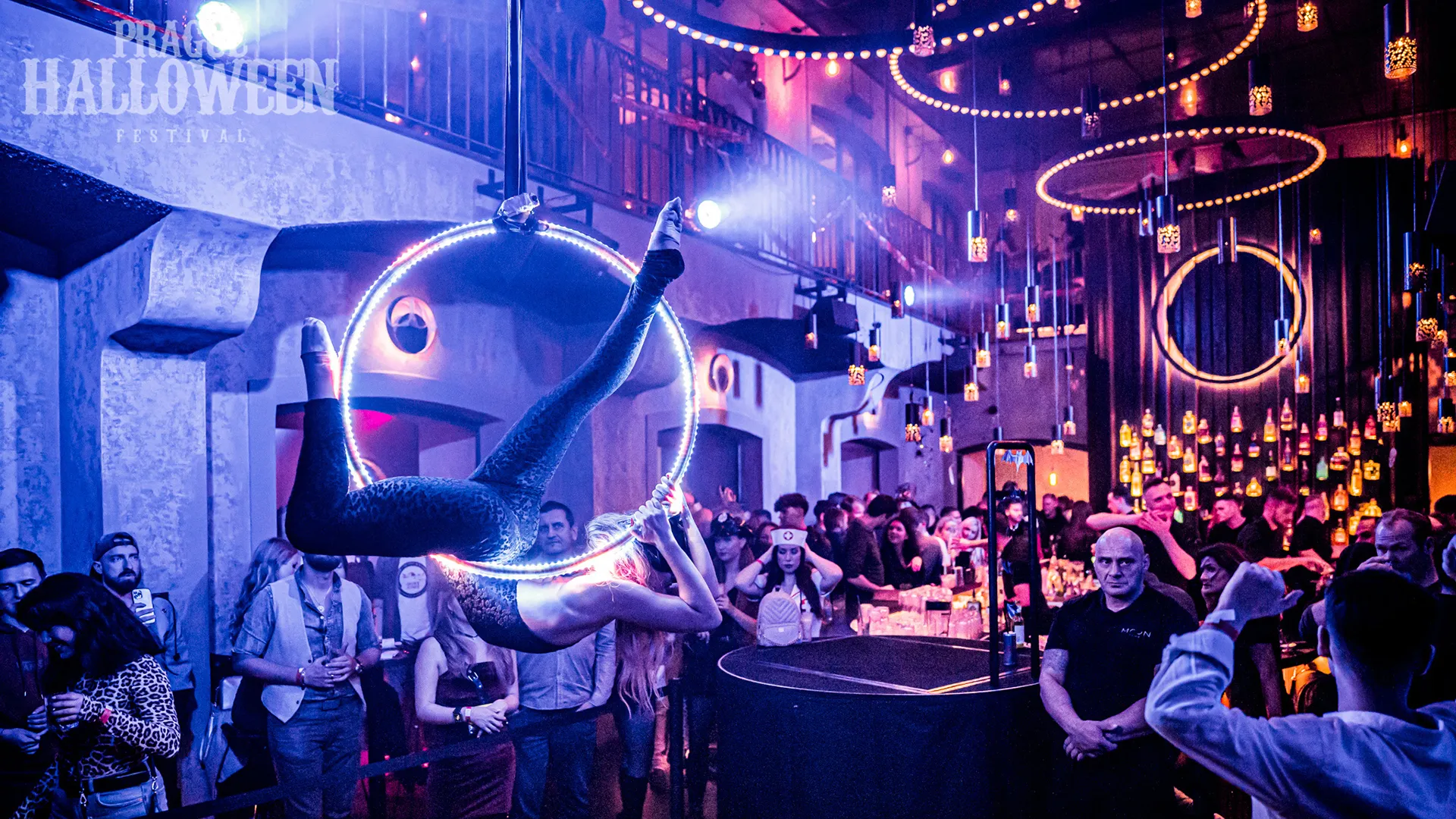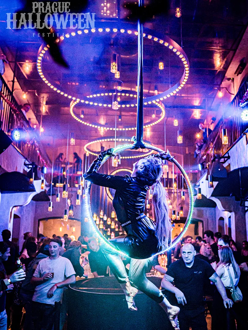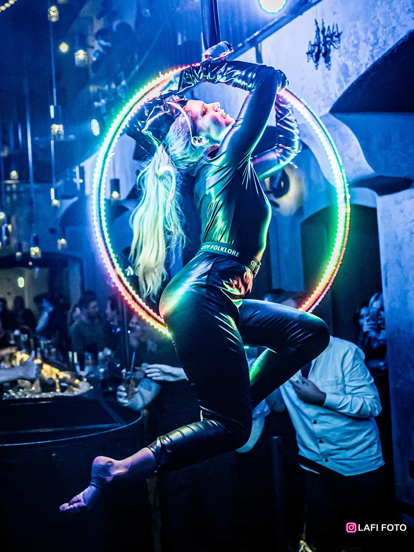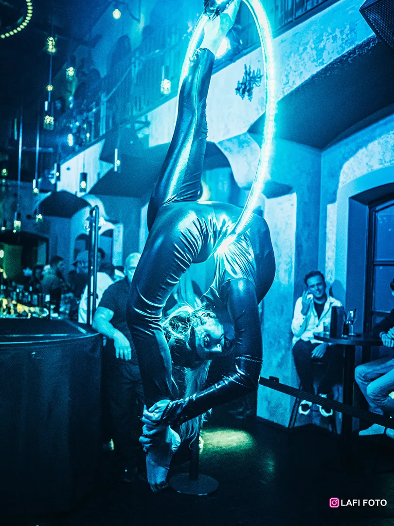 Vzdušná akrobacie na kruhu potěší i náročné diváky. Tento zážitek jsme zpestřili programovatelnými LED světly, která budou zářit do rytmu hudby. LED aerial hoop nabízíme jako samostatné vystoupení, nebo jako doprovodný prvek dalších částí programu. Akrobatka na kruhu může například doplnit kapelu, DJ set, nebo být ozdobou v prostorech vašeho sálu či klubu. Nabízíme několik variant kostýmu podle tématu akce.