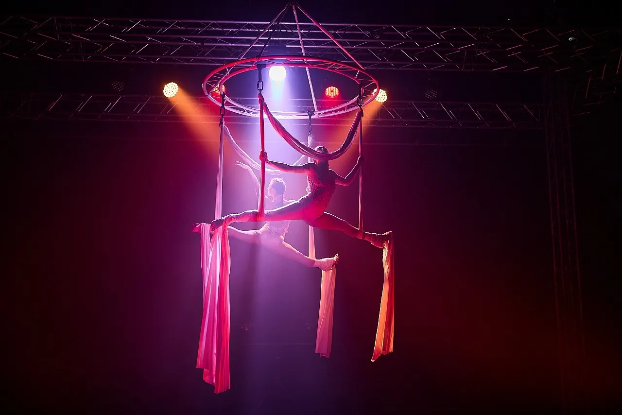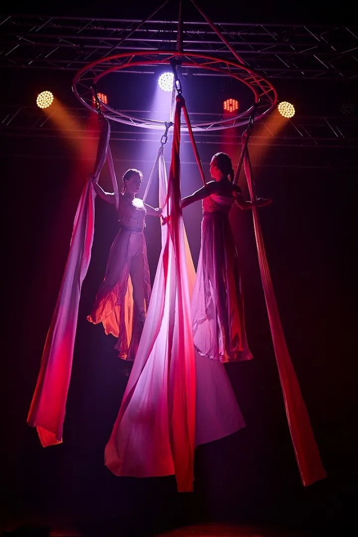 Akrobatická show Zrcadlení je příběhem emocí, důvěry a porozumnění. Dvě akrobatky na šálách navzájem napodobují své pohyby a vysoko nad hlavami diváků vytváří dokonalou vizuální souhru plnou elegance a něhy. Prvotřídní české akrobatky předvedou obtížné prvky, díky kterým získaly několik mezinárodních ocenění. Tato show je skvělou volbou pro náročné diváky, kteří si chtějí užít to nejlepší z české akrobacie.