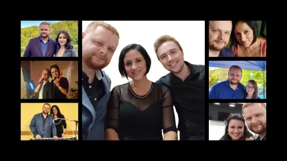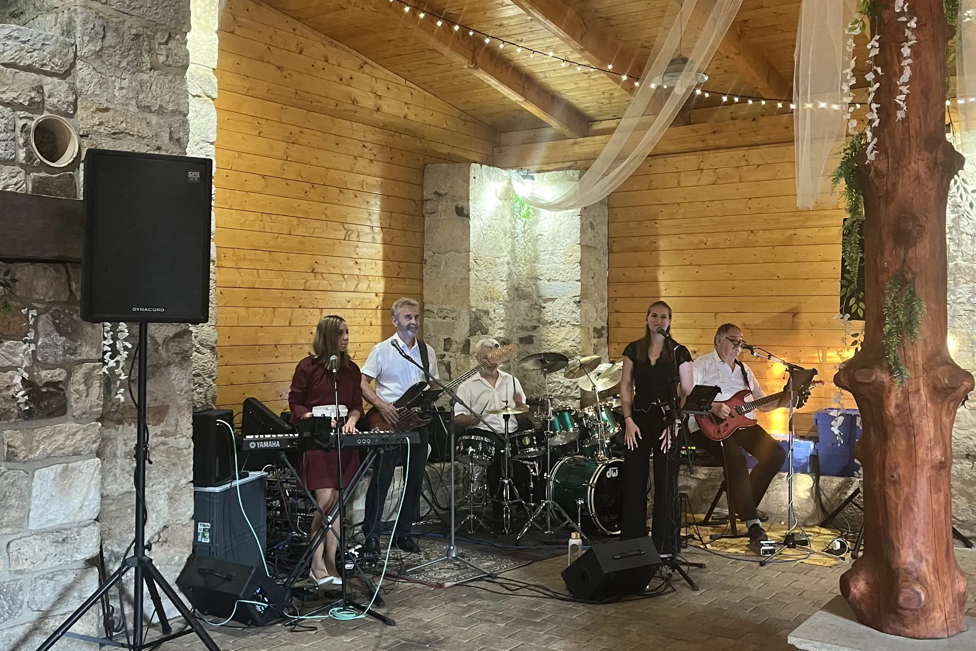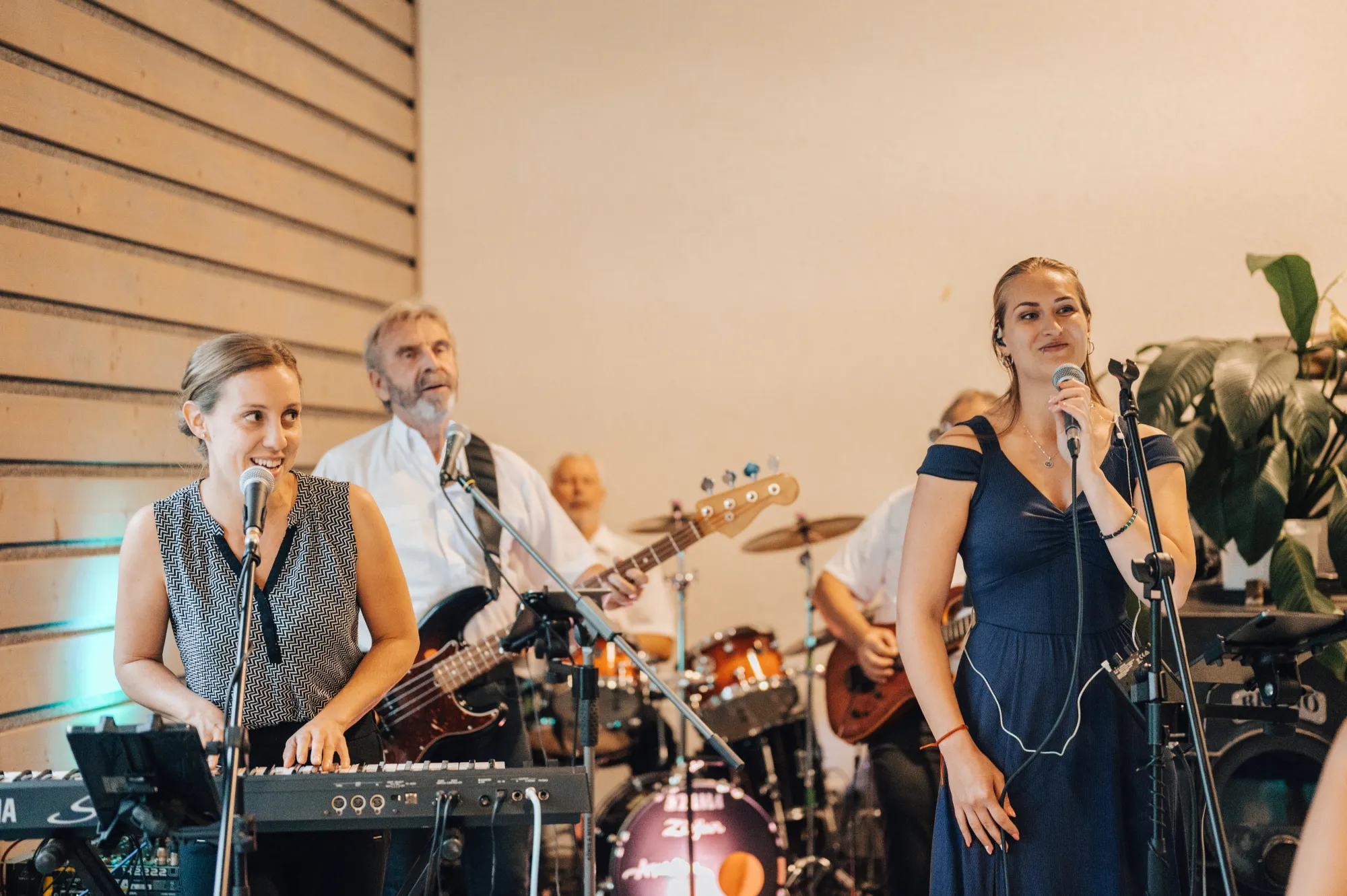 Dvě mladé dámy a tři zkušení muzikanti hrají v obsazení kytara, klávesy, basa, bicí, zpěv. Žádné hotové podklady, klávesové samohrajky, žádný playback.